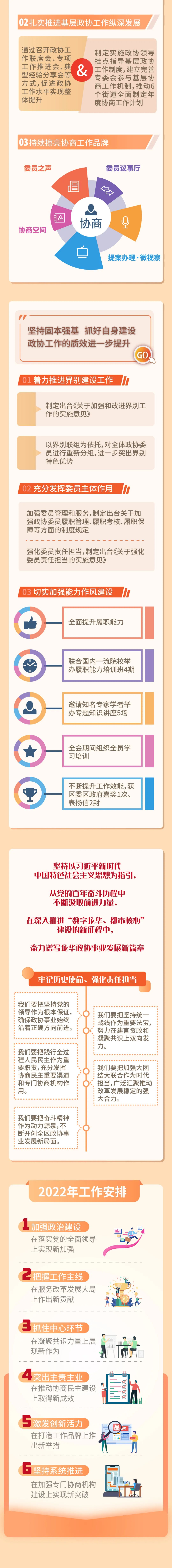 熊佩锦总结了2021年政协主要工作:强化思想引领,把牢政治方向,党对政协工作的领导进一步加强;聚焦中心任务,发挥职能作用,服务发展的成果进一步扩大;坚持民本导向,助推民生改善,履职为民的本色进一步彰显;增强统战功能,持续双向发力,团结奋进的正能量进一步汇聚;突出特色优势,助力基层治理,专门协商机构的作用进一步凸显;坚持固本强基,抓好自身建设,政协工作的质效进一步提升。