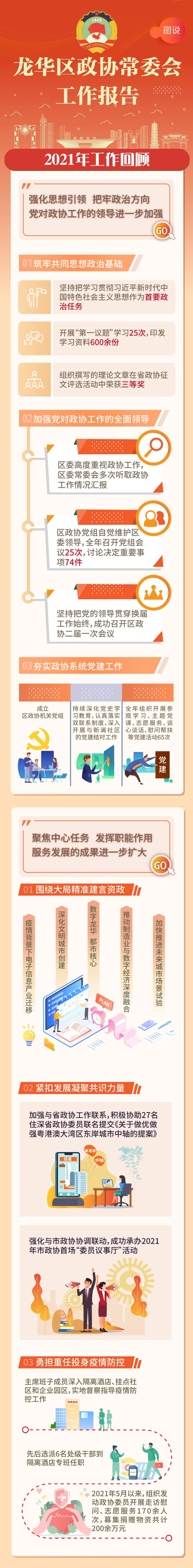 他说,2021年是党和国家历史上具有重要意义的一年,是龙华发展史上具有里程碑意义的一年,也是龙华区政协承前启后、继往开来的一年。在中共龙华区委的坚强领导下,区政协及其常委会,坚持以习近平新时代中国特色社会主义思想为指导,全面贯彻党的十九大和十九届历次全会精神,深入推进落实中央和省委、市委、区委政协工作会议精神,坚持发扬民主和增进团结相互贯通、建言资政和凝聚共识双向发力,顺利完成政协换届工作,圆满完成既定目标任务,全年共召开政协全体会议3次,开展调研协商议政活动100余次,形成调研视察协商报告15份,立案交办提案256件,组织委员参与政协履职3556人次,为推动全区经济社会高质量发展作出了积极贡献。
