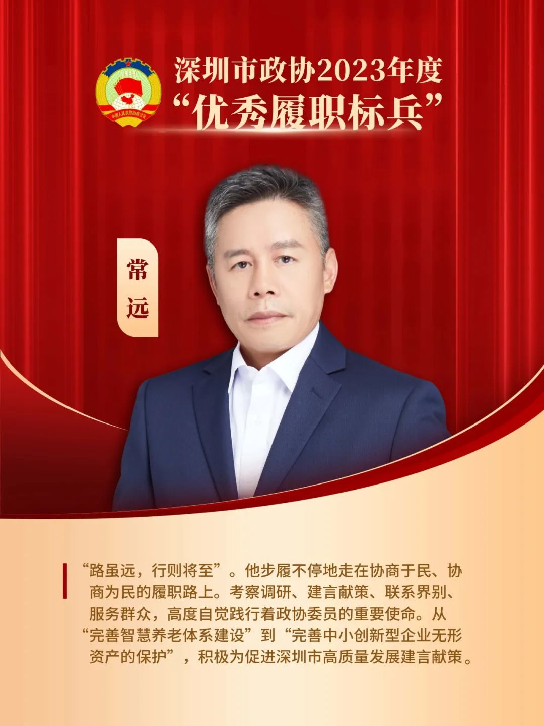 对他的颁奖词是:“‘路虽远,行则将至’。他步履不停地走在协商于民、协商为民的履职路上。考察调研、建言献策、联系界别、服务群众,高度自觉践行着政协委员的重要使命。从‘完善智慧养老体系建设’到‘完善中小创新型企业无形资产的保护’,积极为促进深圳市高质量发展建言献策。”