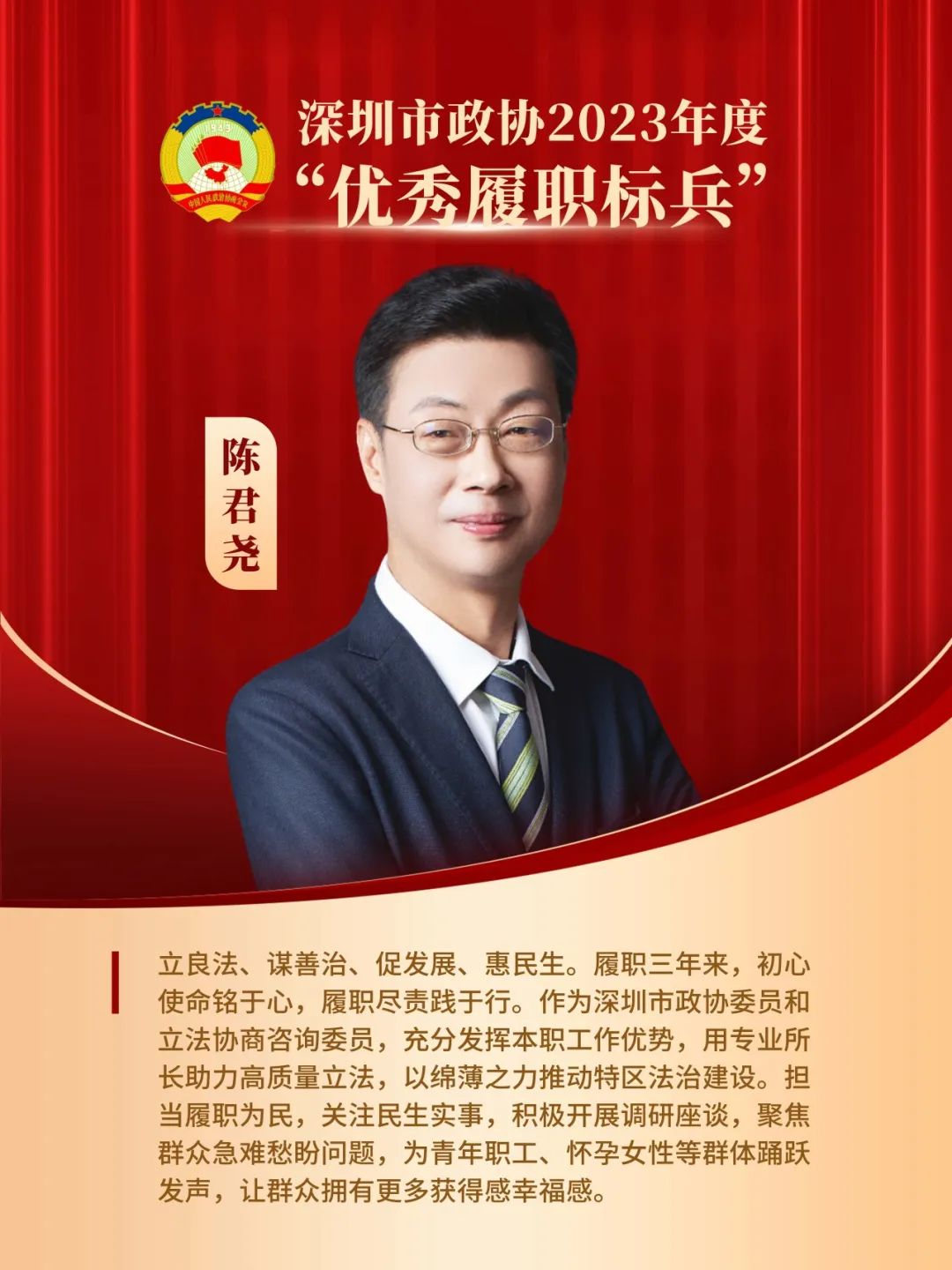 对他的颁奖词是:“立良法、谋善治、促发展、惠民生。履职三年来,初心使命铭于心,履职尽责践于行。作为深圳市政协委员和立法协商咨询委员,充分发挥本职工作优势,用专业所长助力高质量立法,以绵薄之力推动特区法治建设。担当履职为民,关注民生实事,积极开展调研座谈,聚焦群众急难愁盼问题,为青年职工、怀孕女性等群体踊跃发声,让群众拥有更多获得感幸福感。”