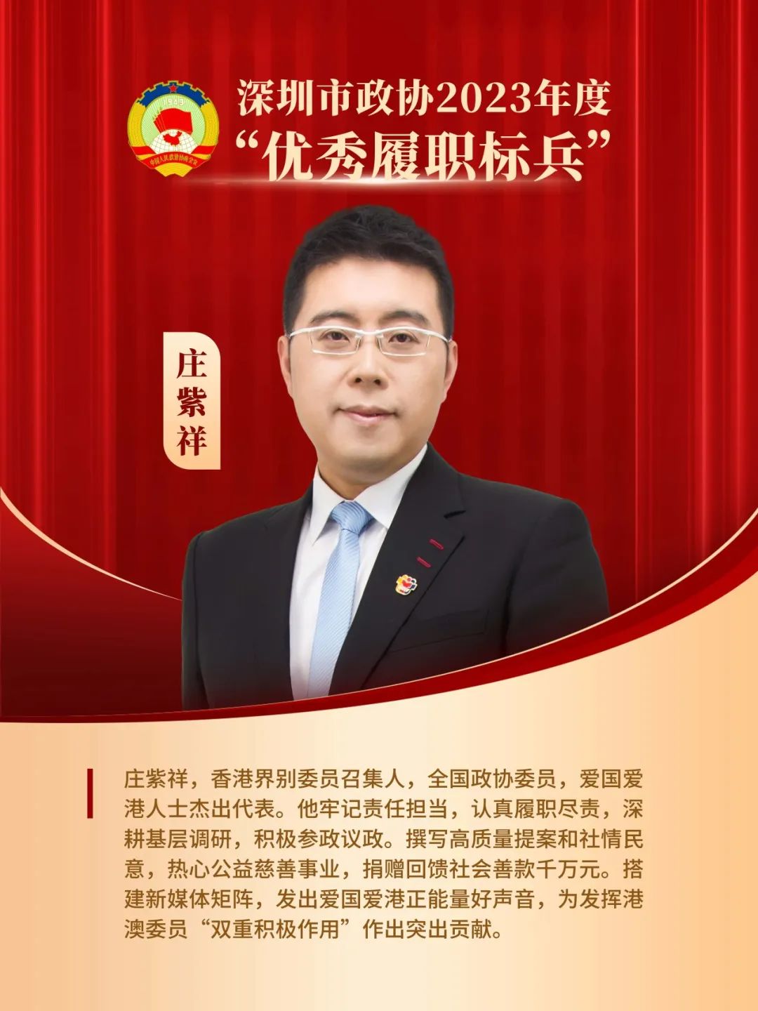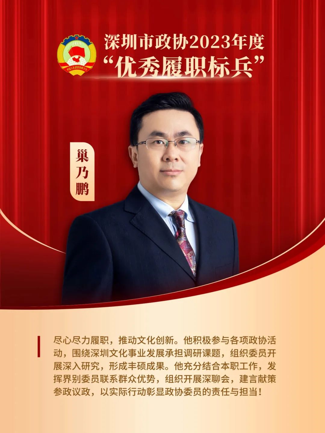 对他的颁奖词是:“尽心尽力履职,推动文化创新。他积极参与各项政协活动,围绕深圳文化事业发展承担调研课题,组织委员开展深入研究,形成丰硕成果。他充分结合本职工作,发挥界别委员联系群众优势,组织开展深聊会,建言献策,参政议政,以实际行动彰显政协委员的责任与担当!”
