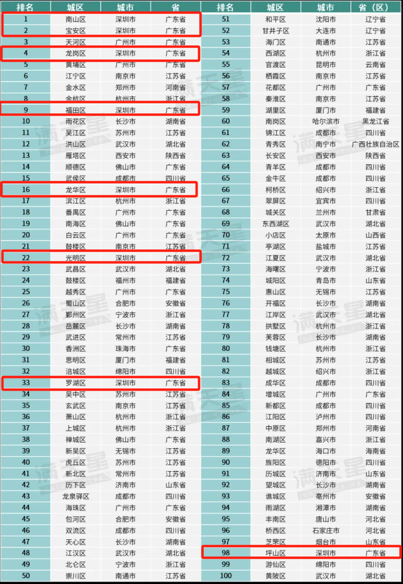 其中南山区蝉联榜单第一