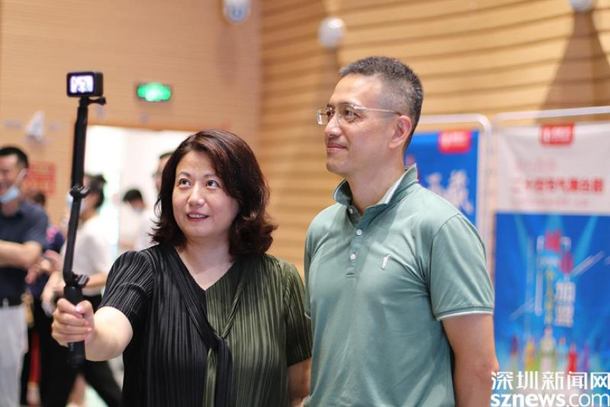 深圳市政协委员叶亚丽(左)和徐向东面对摄像镜头合影。叶亚丽首次尝试用vlog的方式记录政协委员履职过程,本次调研的地点是大浪时尚小镇。