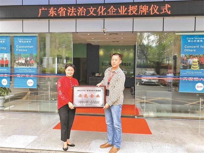 ▲2018年4月,赵艳青(左)出席“广东省法治文化企业”授牌仪式并授牌。