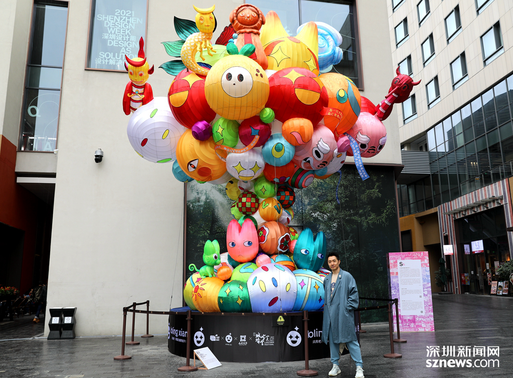 深圳设计周,高少康和他的花灯作品《闪亮吧!穿越古都的孩子!》在深业上城留影。