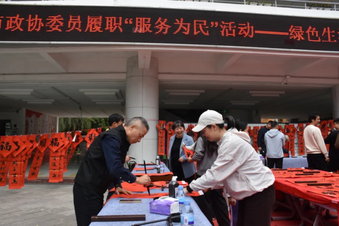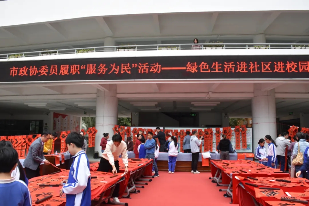 当天,翰林学校活动现场翰墨飘香、红联映目,几名深谙书法艺术的政协委员以笔为媒,书写寓意吉祥的传统春联与“福”字,并结合“绿色生活”主题创作了兼具环保理念的特色春联。师生们携伴而来,手持红纸福笺有序排队,等候“书法家”们挥毫赠联,一张张洋溢着笑容的脸庞,让校园充满了浓浓的年味与书香气息,勾勒出一幅传统文化浸润校园的温暖图景。