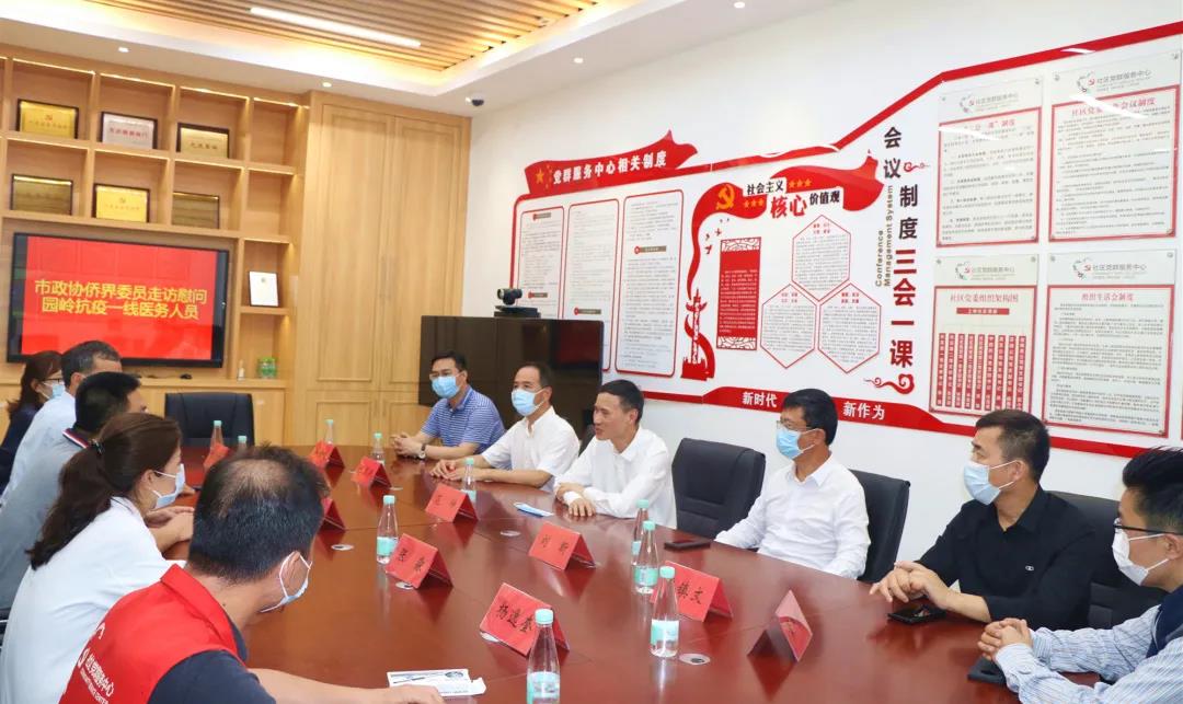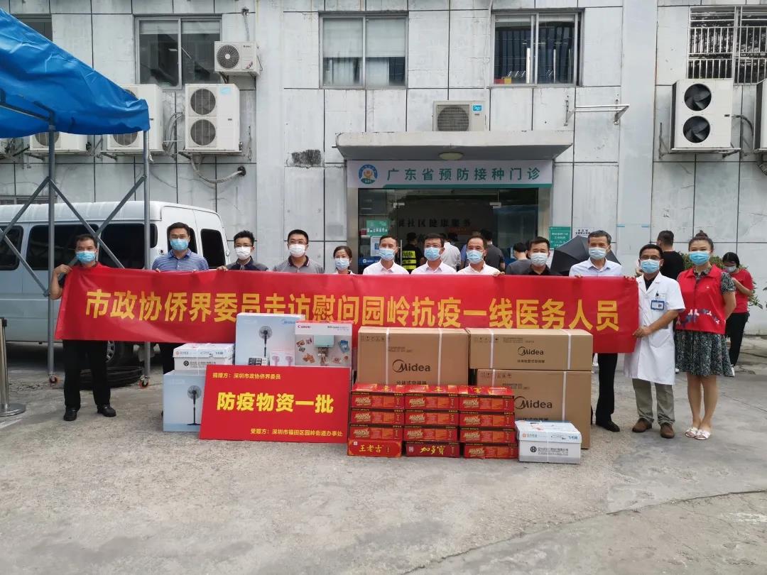 6月17日,市政协港澳台侨和外事委主任范坤与市政协侨界委员刘昕、陈志洪、陈镇文、田佳峻、萧燕珍等一行到福田区园岭街道上林社区八卦岭社康中心慰问一线医务人员和社区工作者,并赠送了格力空调、风扇、黑白打印机、红外线测温仪、塑料方凳等一批防疫物资,将关心关爱带到基层抗疫一线,扎实推进“我为群众办实事”活动。