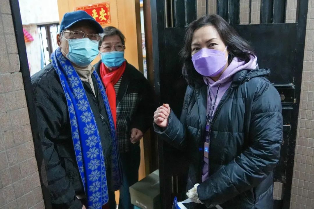 简慧敏在西营盘向香港市民派发抗疫包,在寒冷天气中向小区送暖,并呼吁大家留在家中,同心抗疫。