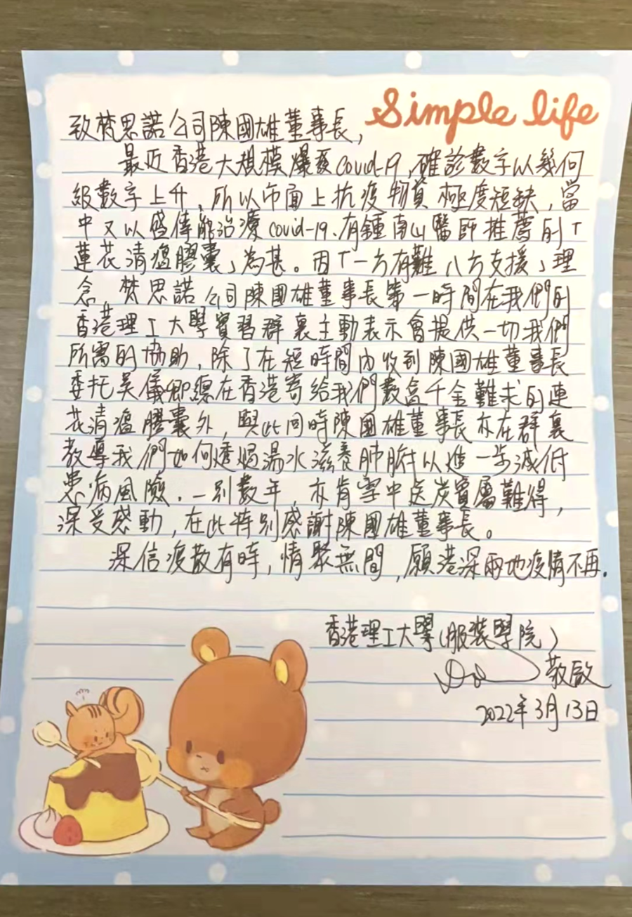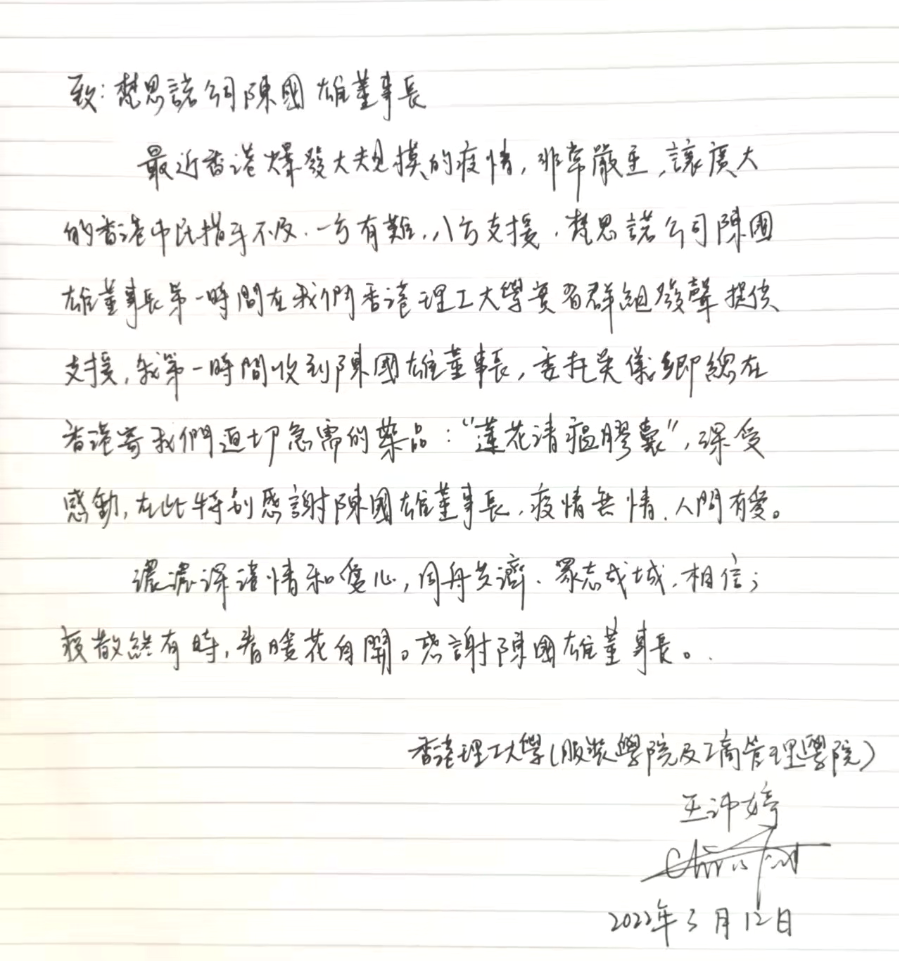 这2封信各出自2位香港理工大学学生代表之手,不远千里寄出此信,以诚挚朴素且正能量的措辞,感谢梵思诺集团陈国雄董事长,在香港疫情肆虐之时,立刻组织了“送药品”行动,把实际的关心、温暖及时送予学生们。