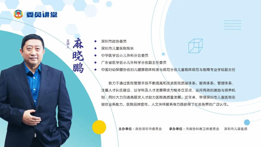 麻晓鹏:深圳市政协委员、深圳市儿童医院院长、中华医学会小儿外科分会委员、广东省医学会小儿外科学分会副主任委员、中国妇幼保健协会妇儿健康临床标准与规范分会儿童临床规范与指南专业学组副主任