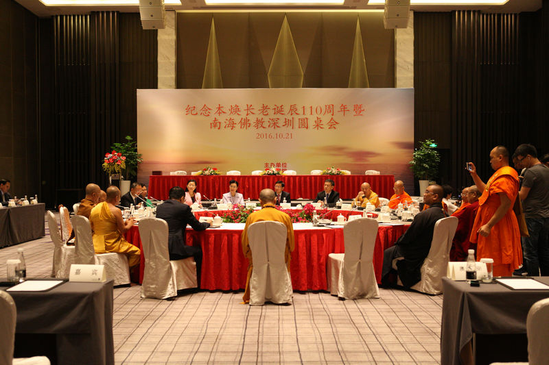 接着,10月21日上午,纪念本焕长老诞辰110周年暨2016南海佛教深圳圆桌会在深圳举行。会上深圳佛教协会牵头柬埔寨、泰国、尼泊尔、斯里兰卡、老挝等国佛教代表共同签署了《南海佛教深圳宣言》。国家宗教事务局蒋坚永副局长,广东省民宗委曾晓辉副主任,海南省民宗委黎才旺副主任,深圳市政协主席戴北方,深圳市委常委、统战部部长林洁,市政协秘书长赵燕民、社法民宗委主任李振河,以及来自南海地区的三大语系佛教领袖、僧众居士及宗教文化官员出席会议,探讨佛教议题,也通过佛教,思考南海地区的现状,期许其美好未来。与会海内外嘉宾认为,促进佛教文化交流,对南海和平繁荣稳定和中国提出的“一带一路”倡议,乃至构建人类命运共同体,都将产生积极作用。(社法民宗委工作处)