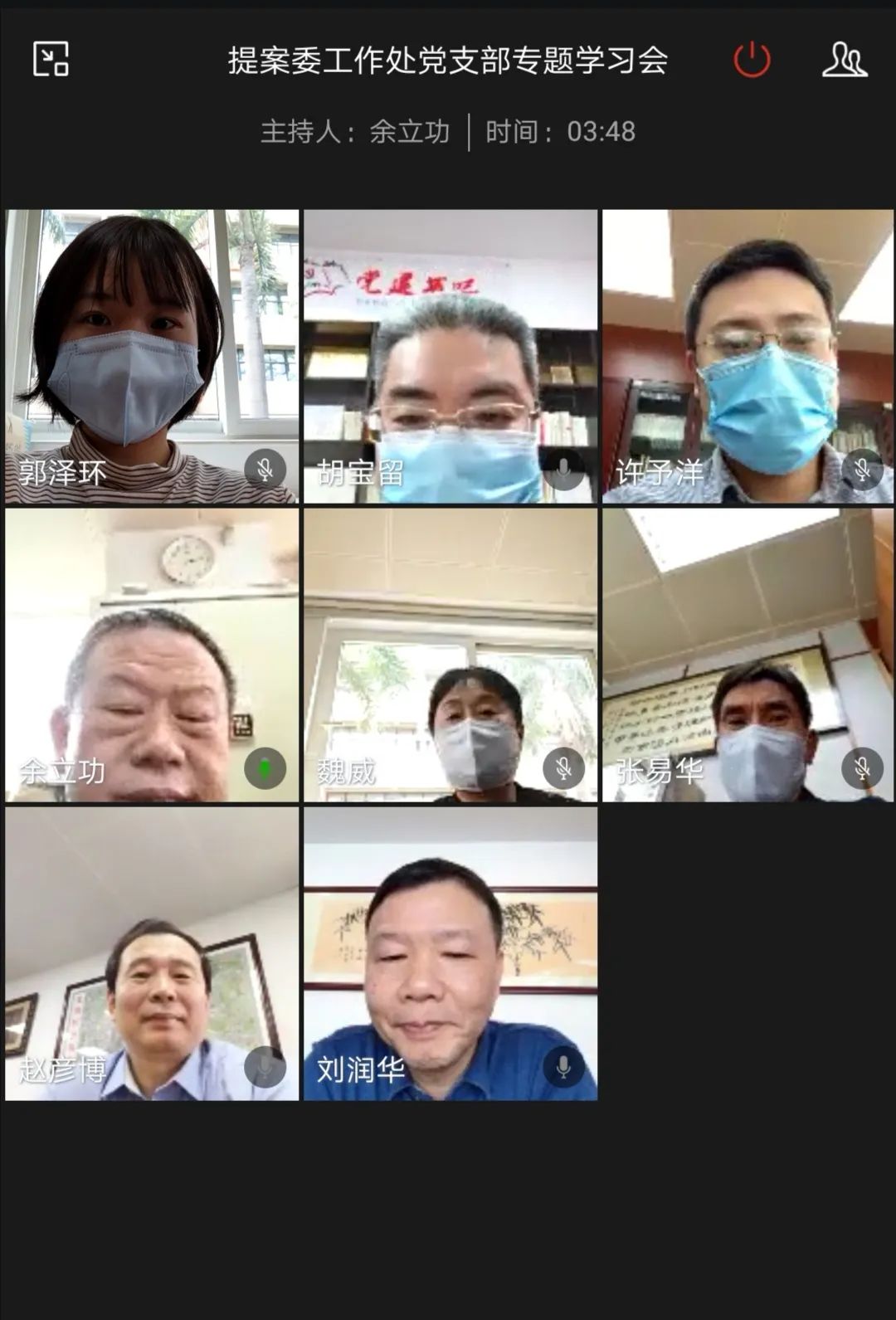 4月17日下午,提案委工作处党支部召开专题学习(视频)会议。市政协党组副书记、常务副主席刘润华参加并发言,余立功、赵彦博、魏威等6名党员参加了会议。