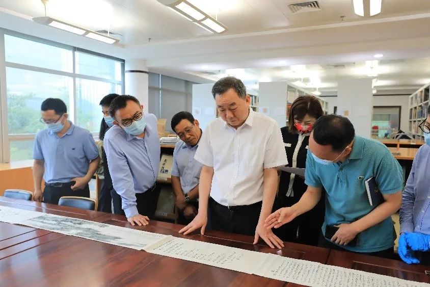 乔恒利一行观摩全国政协原副主席赵朴初等于1987年在深圳集体创作的《西丽湖图》长卷。
