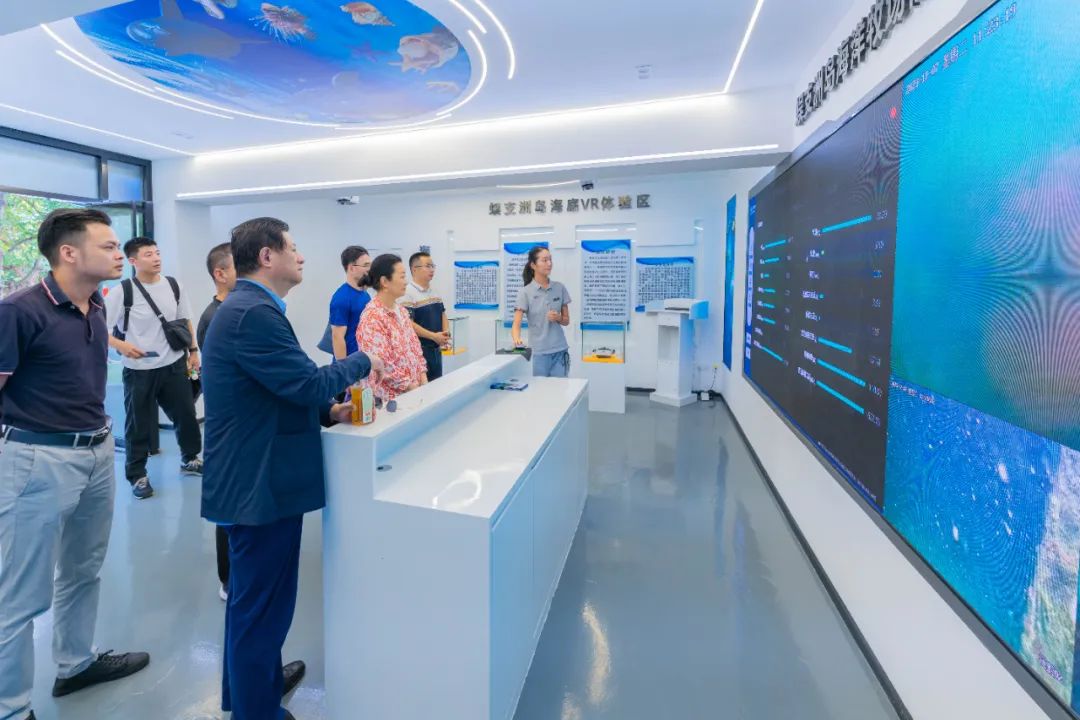 调研组在三亚市蜈支洲岛海域国家级海洋牧场了解热带海洋牧场人工鱼礁投放、人工珊瑚种植、海洋生物栖息环境建设、海洋生态修复和渔业资源养护等情况。调研组还在海洋牧场渔业碳汇示范基地了解三亚市在蓝色碳汇研究与实践情况。