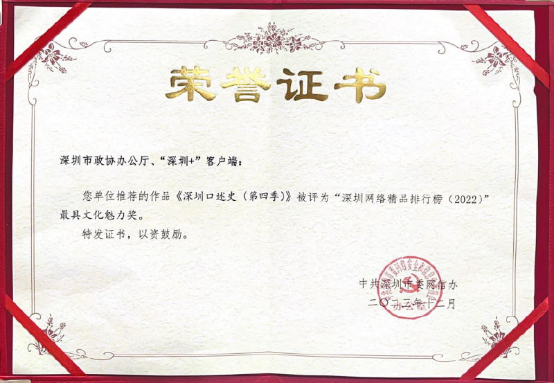 第四季深圳口述史荣获2022年度深圳网络精品排行榜“最具文化魅力奖”