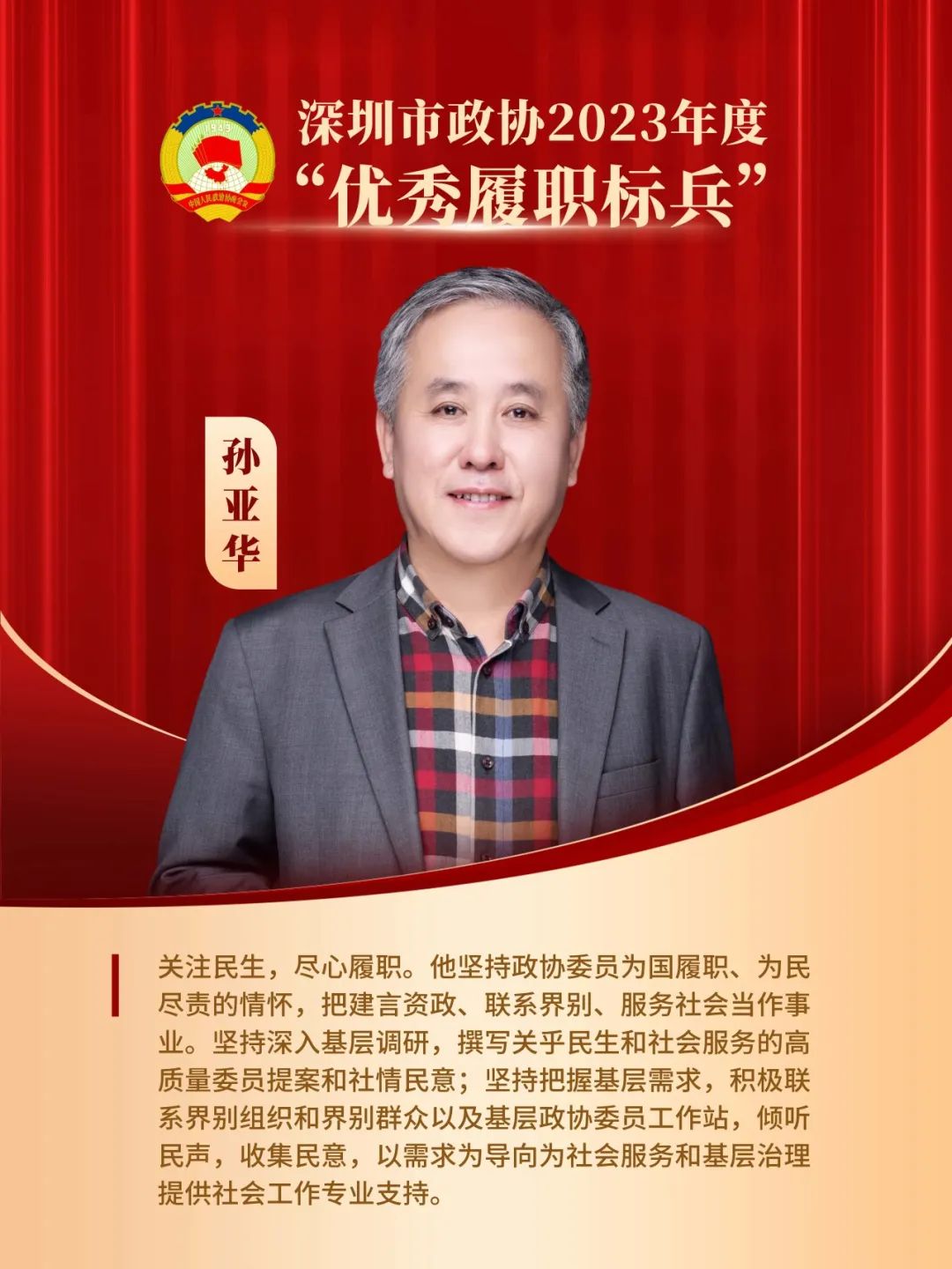 对他的颁奖词是:“‘路虽远,行则将至’。他步履不停地走在协商于民、协商为民的履职路上。考察调研、建言献策、联系界别、服务群众,高度自觉践行着政协委员的重要使命。从‘完善智慧养老体系建设’到‘完善中小创新型企业无形资产的保护’,积极为促进深圳市高质量发展建言献策。”
