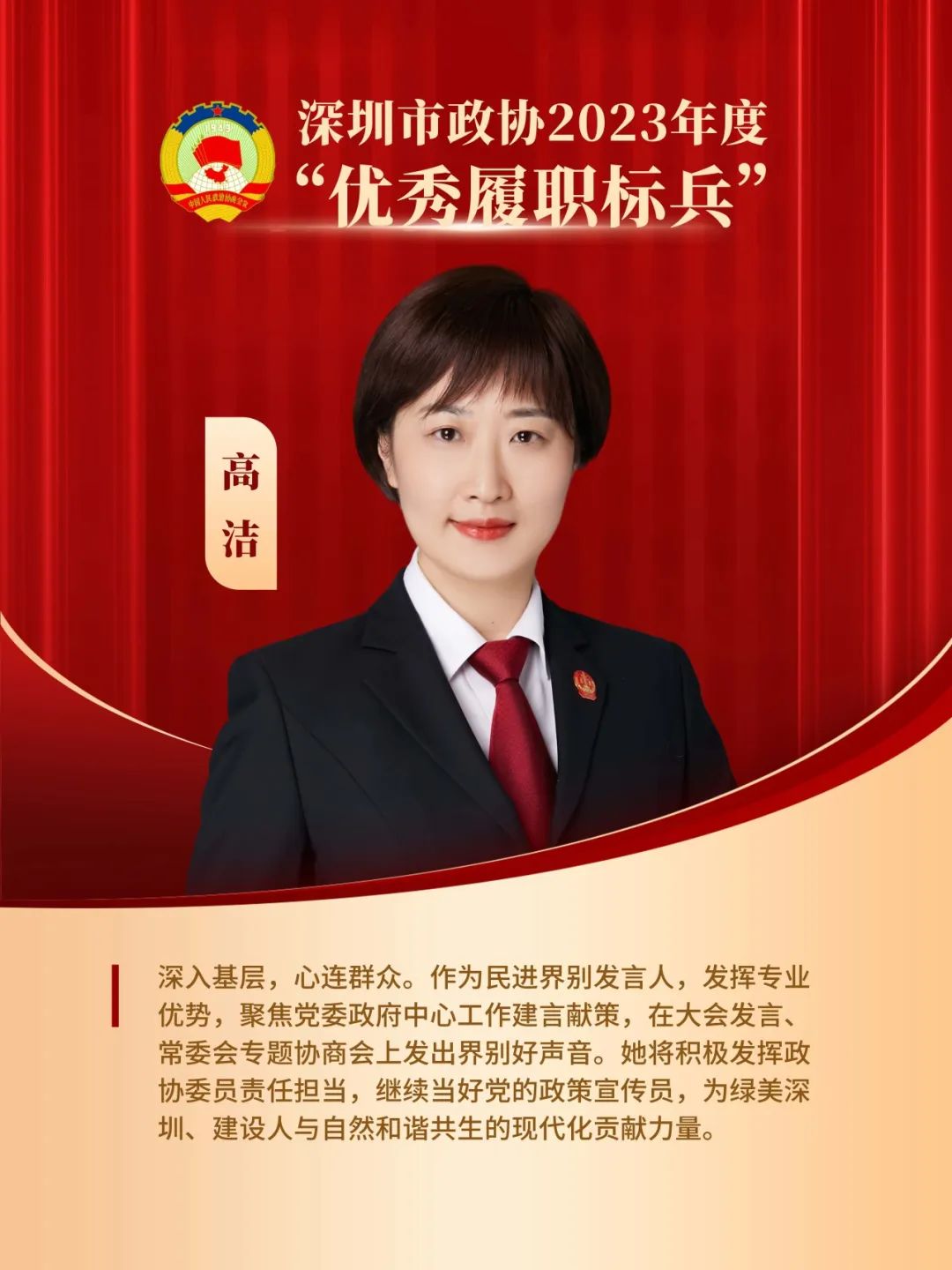 高洁是民进深圳市委会常委,深圳市政协民进界别发言人、市政协委员,深圳市中级人民法院执行局执行裁决处副处长。