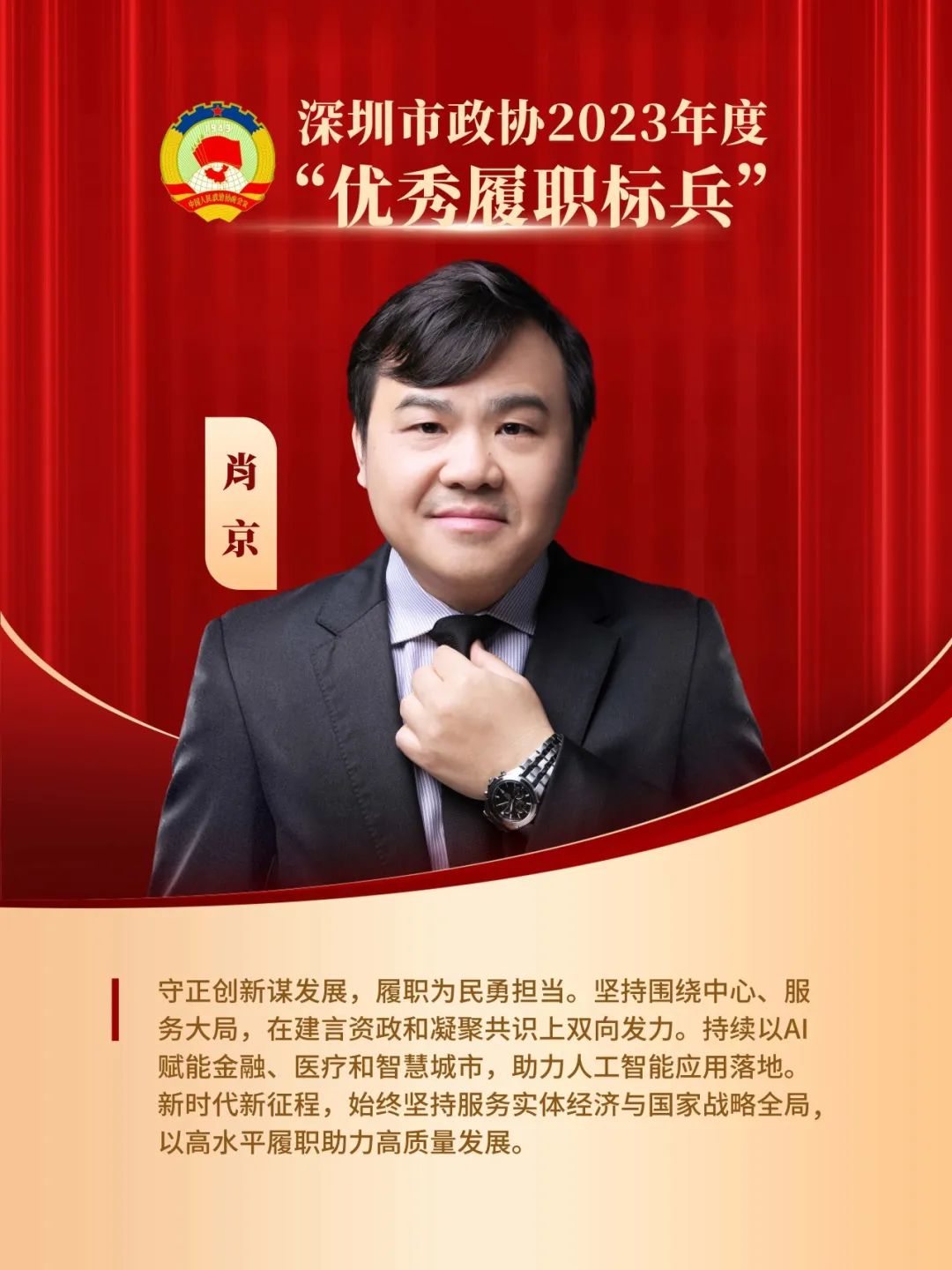 对他的颁奖词是:“守正创新谋发展,履职为民勇担当。坚持围绕中心、服务大局,在建言资政和凝聚共识上双向发力。持续以AI赋能金融、医疗和智慧城市,助力人工智能应用落地。新时代新征程,始终坚持服务实体经济与国家战略全局,以高水平履职助力高质量发展。”
