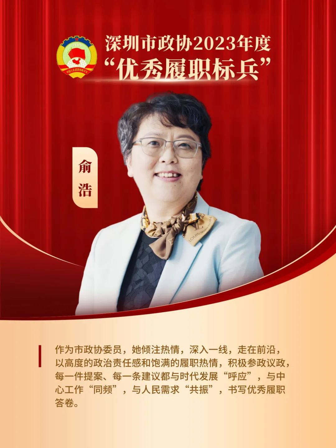 对她的颁奖词是:“深入基层,心连群众。作为民进界别发言人,发挥专业优势,聚焦党委、政府中心工作建言献策,在大会发言、常委会专题协商会上发出界别好声音。她将积极发挥政协委员责任担当,继续当好党的政策宣传员,为绿美深圳、建设人与自然和谐共生的现代化贡献力量。”