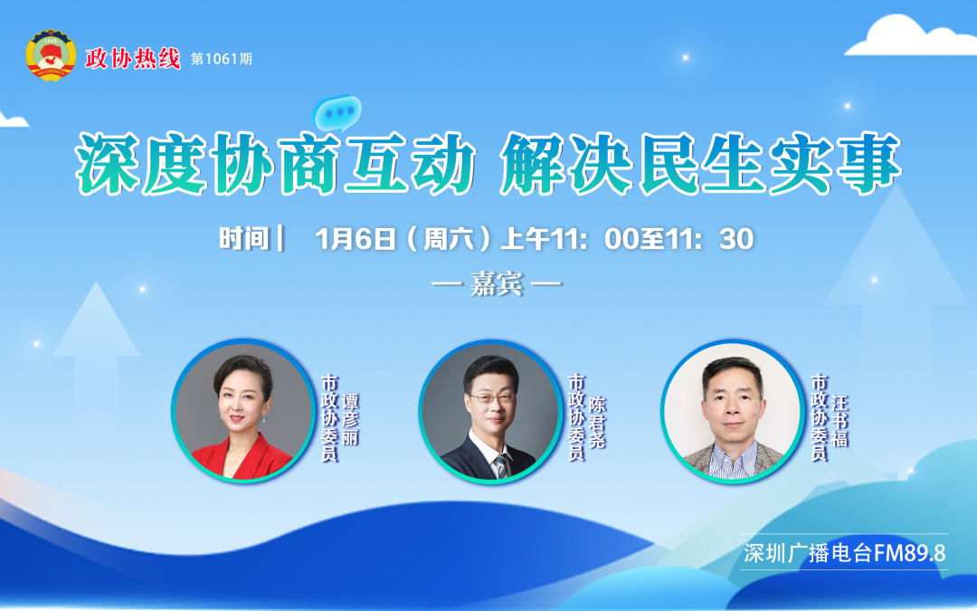 1月6日,第1061期政协热线——《深度协商互动 解决民生实事》在深圳广播电台FM89.8播出。节目邀请了相关政协委员,围绕“深度协商互动 解决民生实事”主题展开热议。