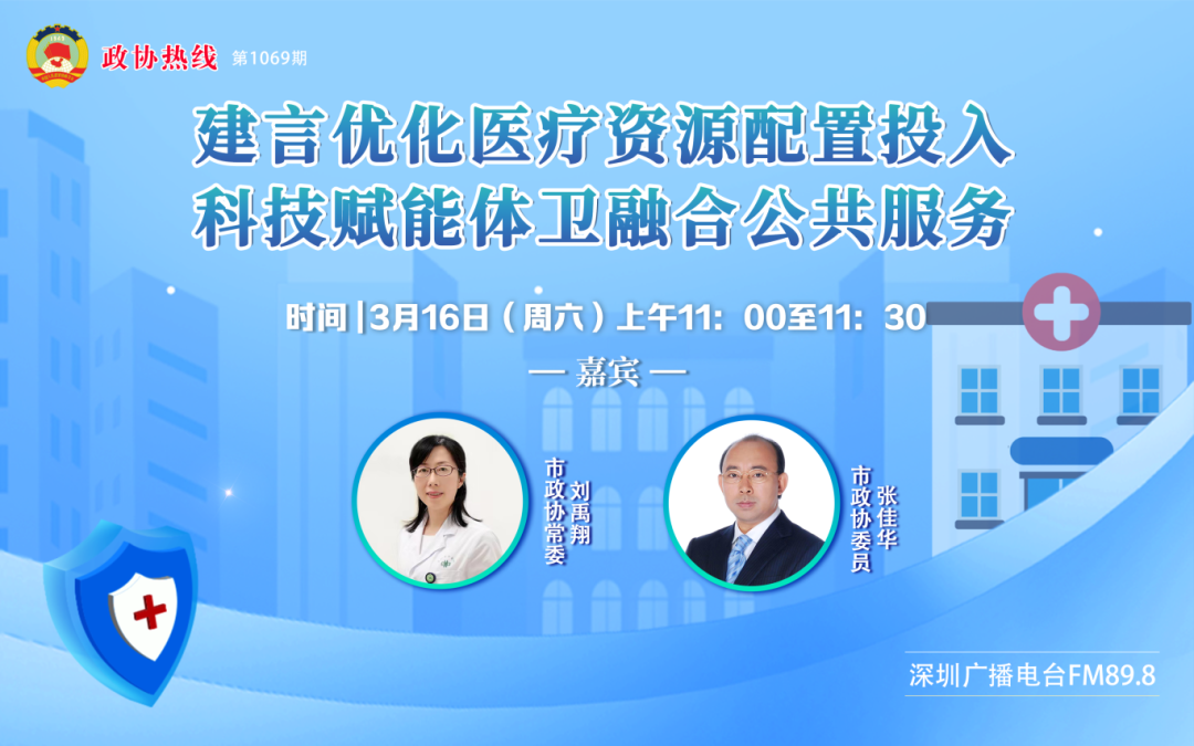 3月16日,第1069期政协热线——《建言优化医疗资源配置投入 科技赋能体卫融合公共服务》在深圳广播电台FM89.8播出。节目邀请了相关政协委员,围绕“建言优化医疗资源配置投入 科技赋能体卫融合公共服务”主题展开热议。