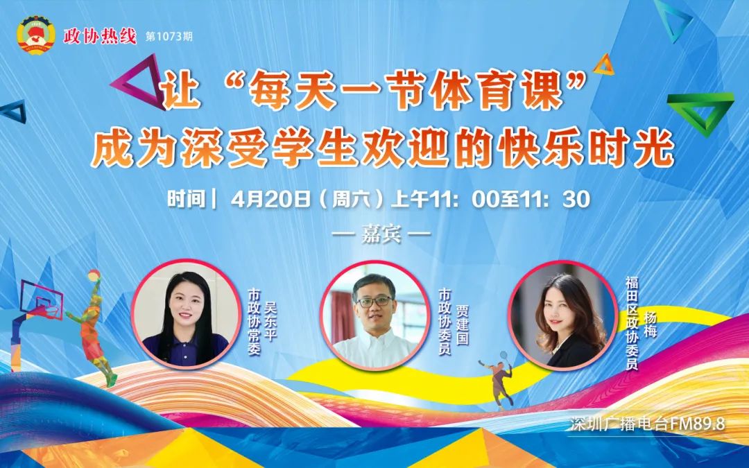 第1073期政协热线节目《让“每天一节体育课”成为深受学生欢迎的快乐时光》将于4月20日(周六)上午11:00至11:30在深圳广播电台FM89.8播出,敬请收听!