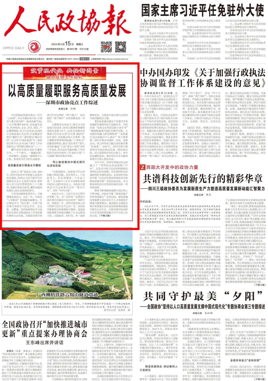 5月15日《人民政协报》头版头条刊发《以高质量履职服务高质量发展——深圳市政协亮点工作综述》,现全文转载如下。
