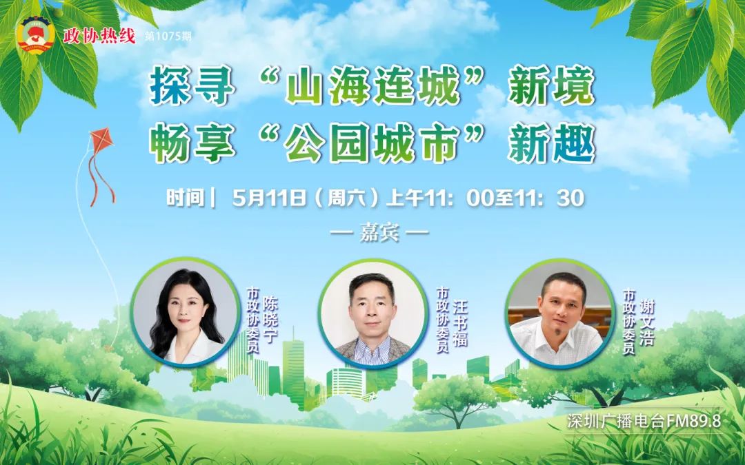 5月11日,第1075期政协热线——《探寻“山海连城”新境 畅享“公园城市”新趣》在深圳广播电台FM89.8播出。节目邀请了相关政协委员,围绕“探寻‘山海连城’新境 畅享‘公园城市’新趣”主题展开热议。