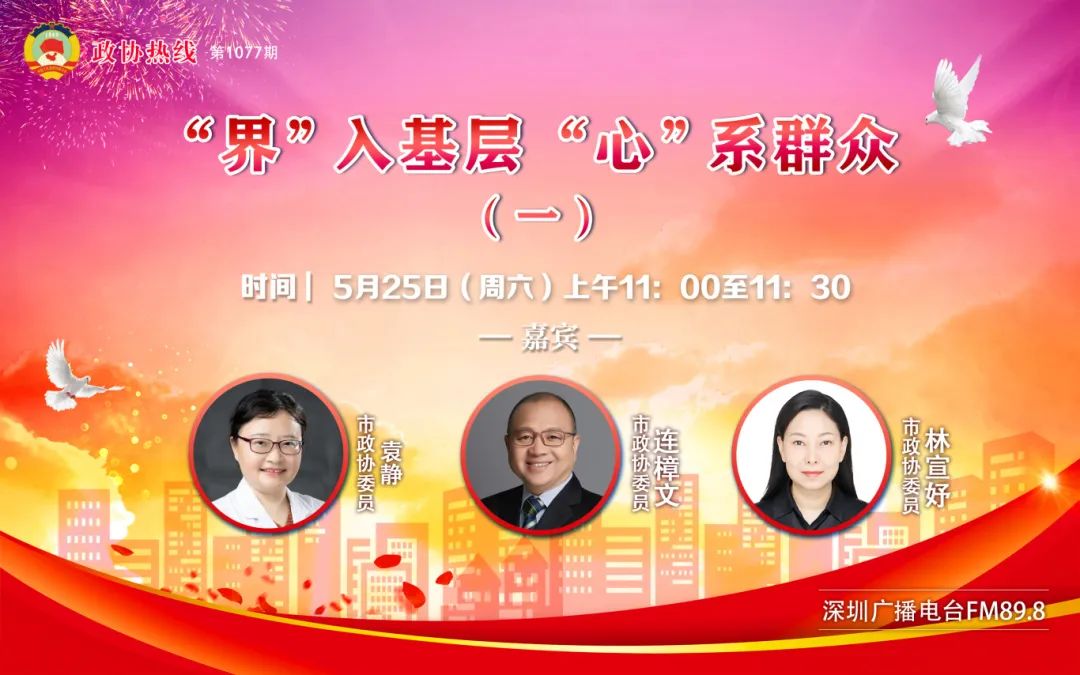第1077期政协热线节目《“界”入基层 “心”系群众(一)》将于5月25日(周六)上午11:00至11:30在深圳广播电台FM89.8播出,敬请收听!