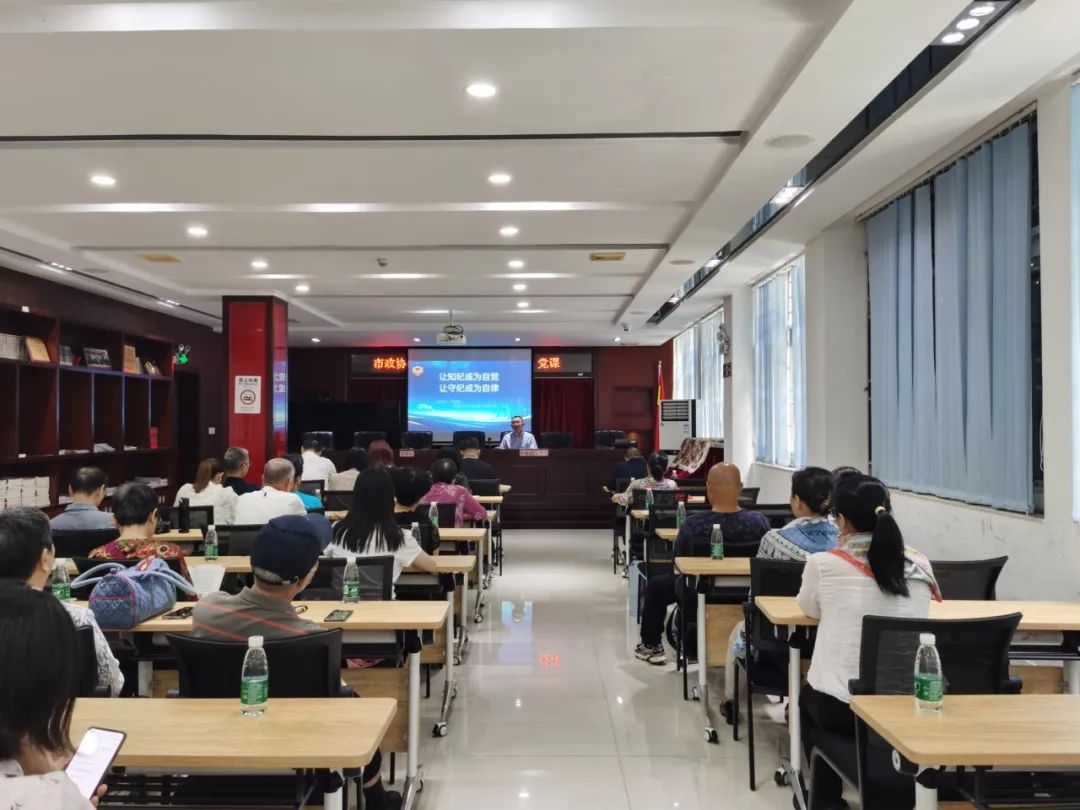 市政协文化文史委主任尹昌龙以“让知纪成为自觉,让守纪成为自律”为题,结合学习和工作的实际,从必须明确能干什么不能干什么、必须把知和行统一起来、必须从他律走向自律三个方面讲述如何学纪、知纪、明纪、守纪。尹昌龙表示,现在全面从严治党是主基调,越往后执纪越严,因此学习《中国共产党纪律处分条例》,加强纪律教育尤为必要。