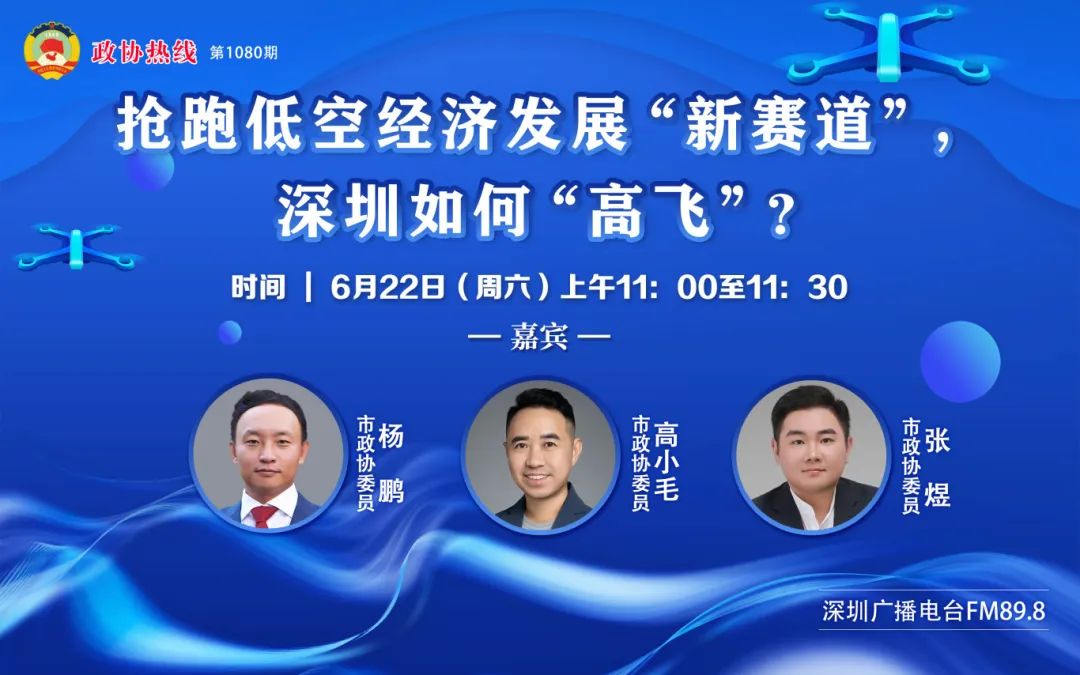 第1080期政协热线节目《抢跑低空经济发展“新赛道”,深圳如何“高飞”?》将于6月22日(周六)上午11:00至11:30在深圳广播电台FM89.8播出,敬请收听!