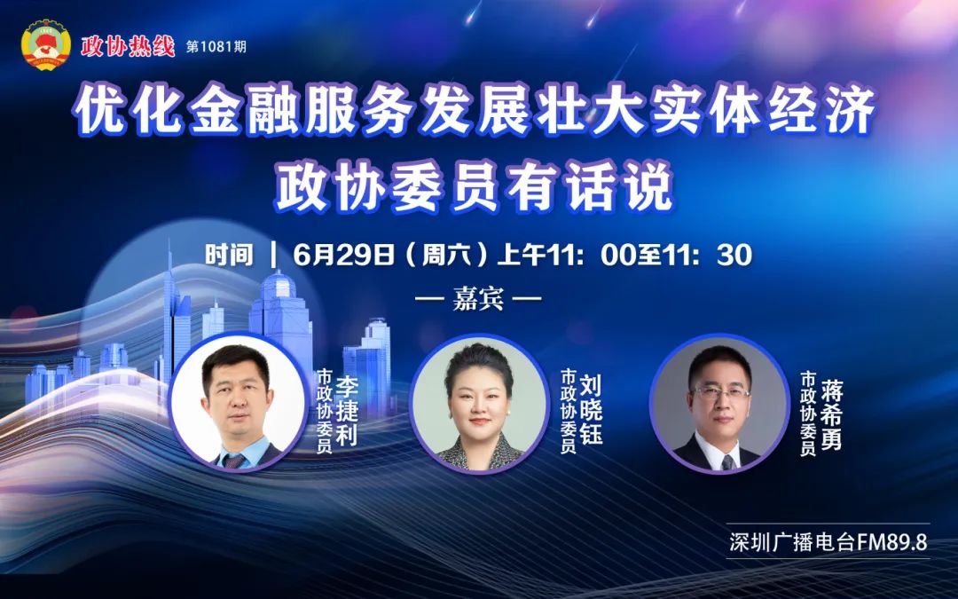 第1081期政协热线节目《优化金融服务发展壮大实体经济 政协委员有话说》将于6月29日(周六)上午11:00至11:30在深圳广播电台FM89.8播出,敬请收听!