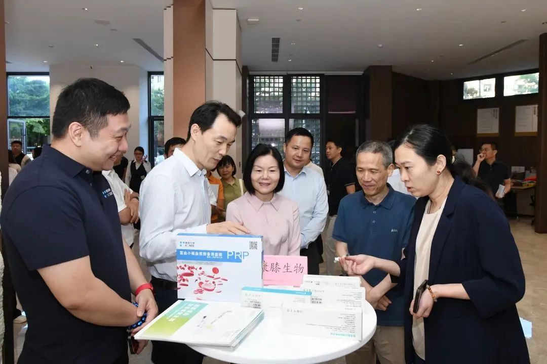 座谈交流结束后,与会人员来到位于区级委员工作站大厅的产品展示区。康膝生物研发的国内首个且目前唯一一款获批注册证的软骨再生材料和再生医学产品-胶原蛋白软骨修复支架,新产业生物全自主研发的新一代实验室流水线-SATLARS T8,理邦全新一代湿式血气新品-i500全自动血气电解质分析仪等一批行业领先的高端国产医疗设备和药品纷纷亮相,引起了广泛关注。医企双方在产品展示区进行了热烈探讨和深度沟通,纷纷表达了在产品需求、临床试验、医工结合等方面开展合作的强烈意愿。