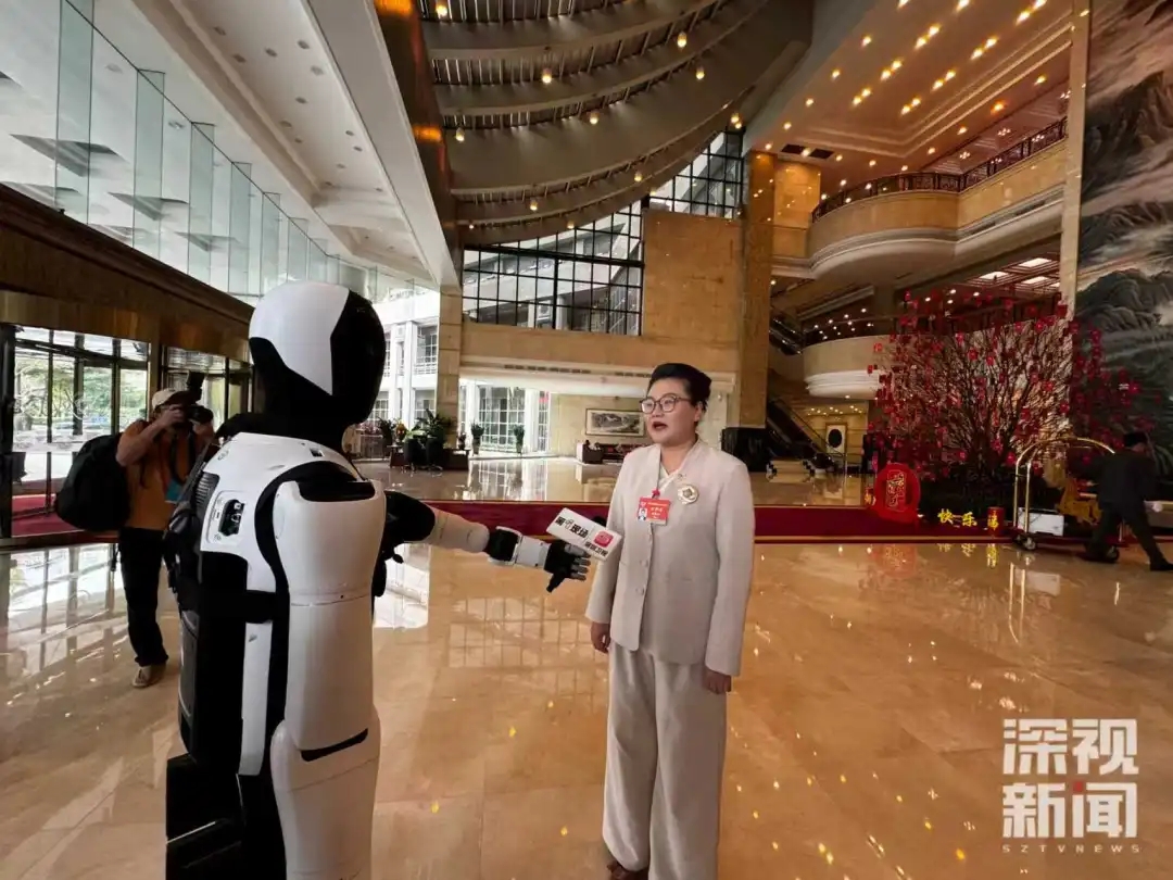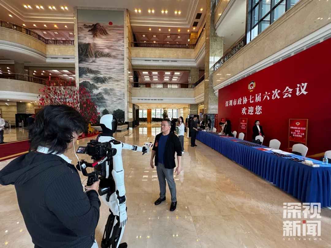 报到现场,优必选Walker S2机器人作为本次深圳“两会时间”深视新闻特约“记者搭子”,举着采访麦与委员们交流互动,吸引不少目光。