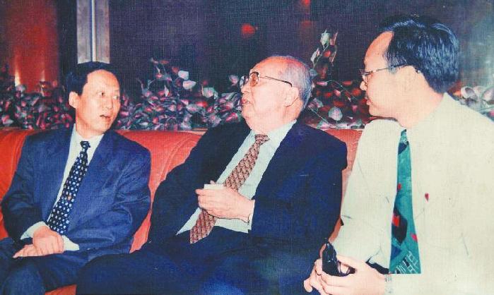 1995年,时任全国人大常委会副委员长王光英(中)到深视察文化产业发展,在沙都艺术团与温锦培(右一)和时任文化局局长苏伟光(左一)等人交谈。