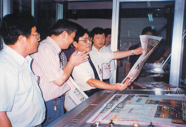 1997年7月1日凌晨,总编辑高兴烈(左三)在印刷机旁审阅第一份庆香港回归《深圳商报》版面。
