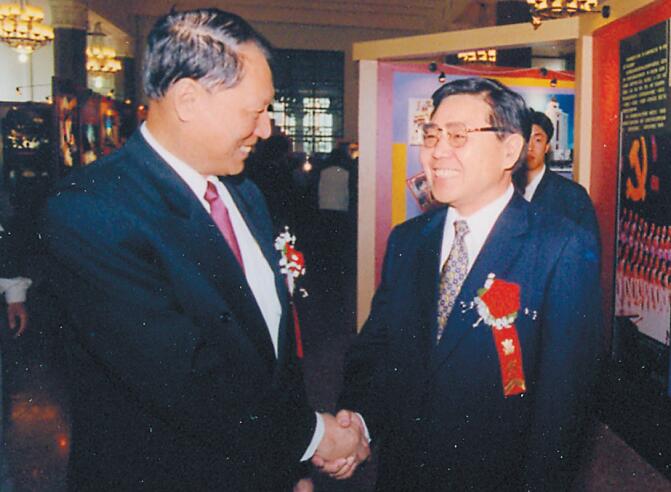 1999年9月,在“新中国新闻事业50年成就展”上,时任全国人大常委会副委员长成思危(左)向深圳商报社总编辑高兴烈表示祝贺。