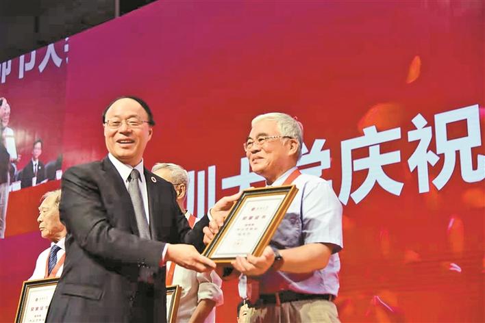 ▲2019年9月10日,第35届教师节,深圳大学授予陈思平(右)等3人“杰出贡献奖”。