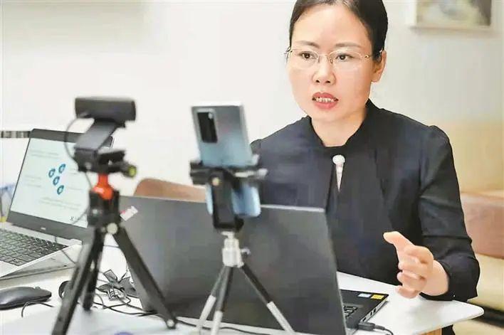 ▲肖迎红在疫情防控期间做公益普法公开课直播。