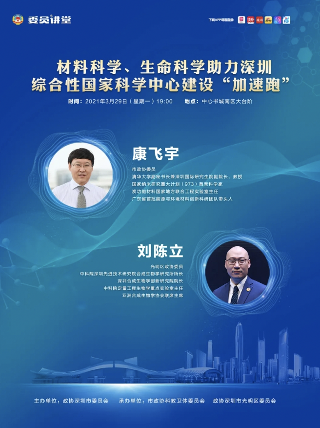 29日,市政协2021年首场“委员讲堂”在深圳书城举行。首场“委员讲堂”以“材料科学、生命科学助力深圳综合性国家科学中心建设”为主题,由市政协委员、清华大学副秘书长兼深圳国际研究生院副院长康飞宇主讲“从石墨到石墨烯——碳材料创新与低碳科技”,光明区政协委员、中科院深圳先进技术研究院合成生物学研究所所长刘陈立主讲“深圳合成生物创新与产业发展”。