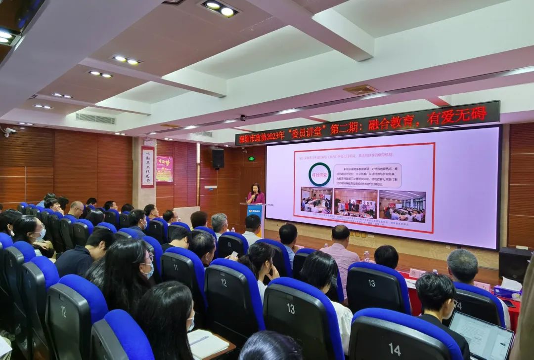 6月5日,市政协“委员讲堂”在盐田区外国语小学海涛分校举行,市政协委员、深圳元平特殊教育学校党委书记曹艳围绕“融合教育,有爱无碍”的主题开讲。市政协副主席吴以环参加活动并慰问了学校特殊教育学生,为他们送去了书包、书籍等礼物。
