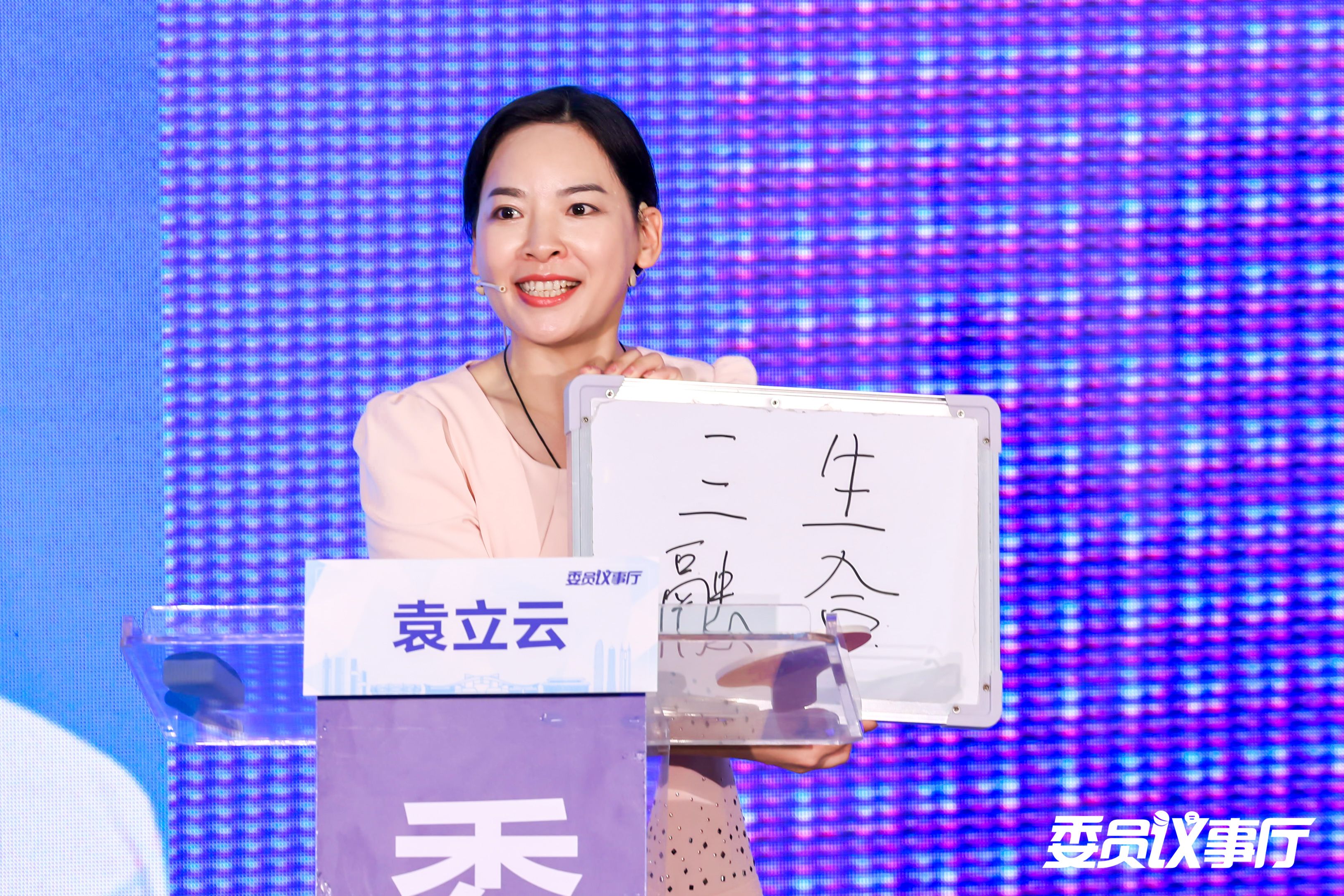 宝安区政协委员袁立云展示关键词“三生融合”,即打造集生产、生活、生态于一体的产城融合园区。