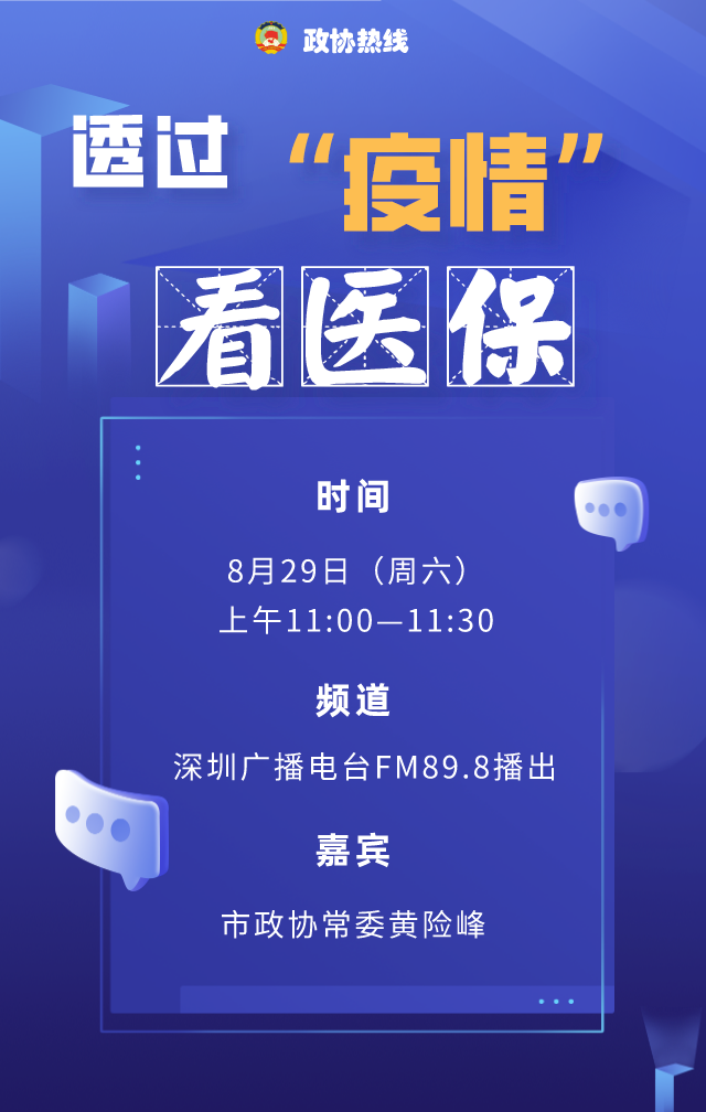 8月29日(周六)上午11点至11点30分,深圳市政协委员黄险峰将做客深圳广播电台FM89.8,在政协热线中相约畅聊,主题为:透过疫情看医保,敬请收听!