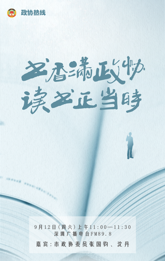 9月12日(周六)上午11点至11点30分,深圳市政协委员张国钧、沈丹将做客深圳广播电台FM89.8,在政协热线中相约畅聊,主题为:书香满政协,读书正当时。敬请收听!