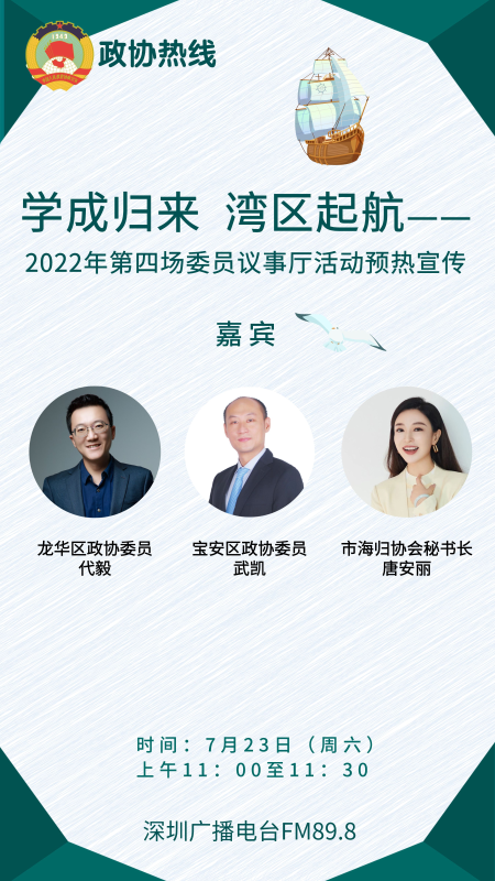 7月23日,深圳市宝安区政协委员武凯、龙华区政协委员代毅,深圳市海归协会秘书长唐安丽做客政协热线,围绕《学成归来湾区起航——2022年第四场委员议事厅活动预热宣传》分享了自己的看法。