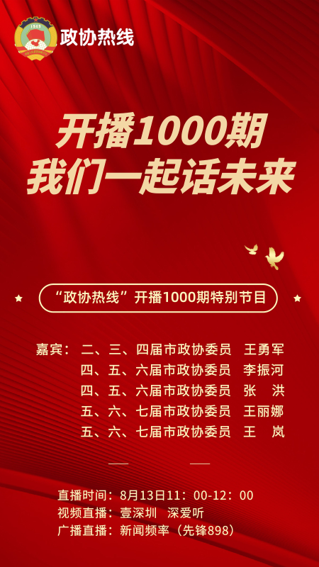 2022年8月13日上午,政协热线第1000期特别节目《开播1000期,我们一起话未来》邀请了嘉宾:王勇军、李振河、王岚、王丽娜、张洪,与主持人陈希一起回首过往,共话未来。