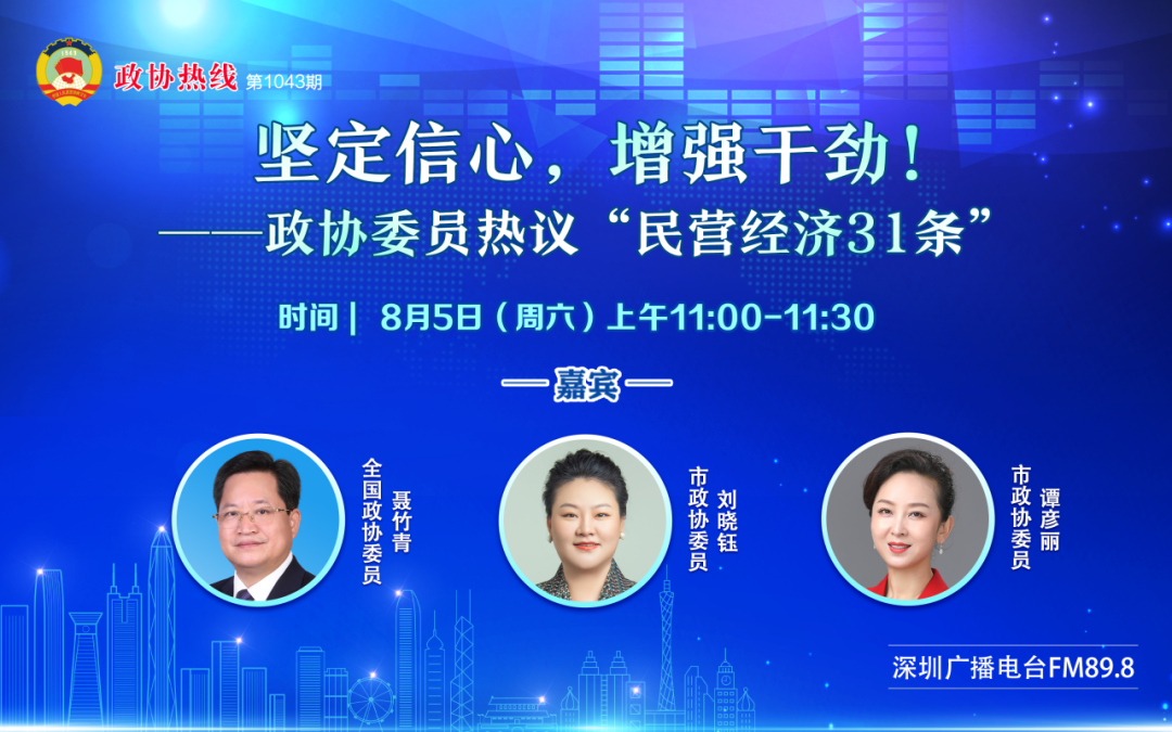 2023年8月5日(周六)上午11:00至11:30,第1043期政协热线节目《坚定信心,增强干劲!——政协委员热议“民营经济31条”》在深圳广播电台FM89.8播出。