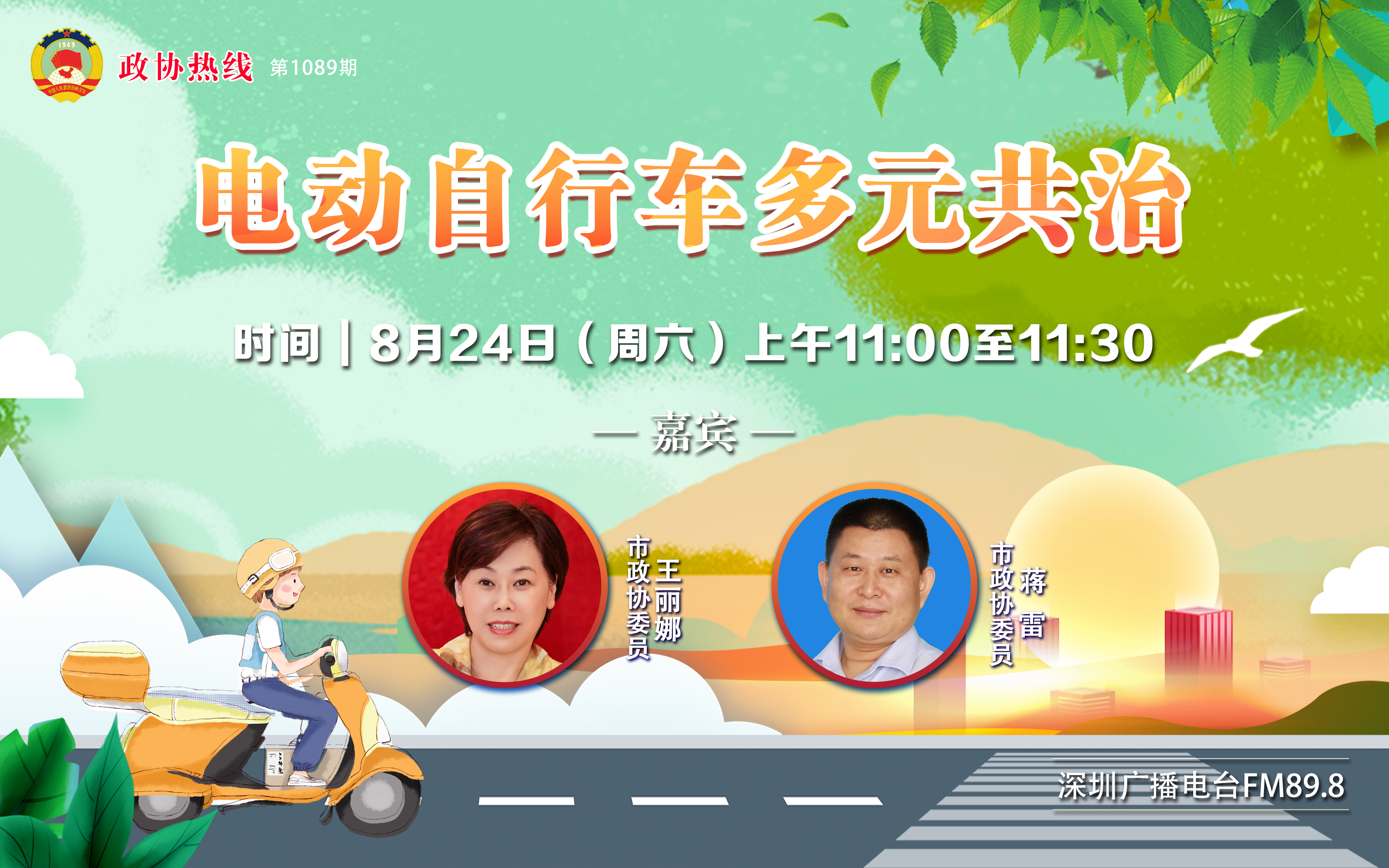 随着深圳电动自行车保有量逐年增长,电动自行车衍生出的社会治理问题引起多方关注。深圳该如何凝聚多元力量,在加强安全监管与满足群众生活需求之间找到平衡?8月9日,市政协“委员议事厅”活动邀请市、区政协委员及专家,围绕“电动自行车多元共治”主题积极建言献策。今天我们邀请了市政协委员、市社会组织总会常务副会长、市新联会监事长、广东瑞霆律师事务所主任王丽娜,市政协委员、宝安区海同社会工作服务中心党支部书记、理事长蒋雷来到直播间与大家聊聊电动自行车多元共治等话题… …